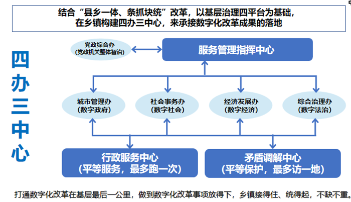 通过“四办三中心”的落地,做到部门条线数字化改革事项放得下,乡镇面上数字化管理服务接得住、统得起,既不缺位也不重合。