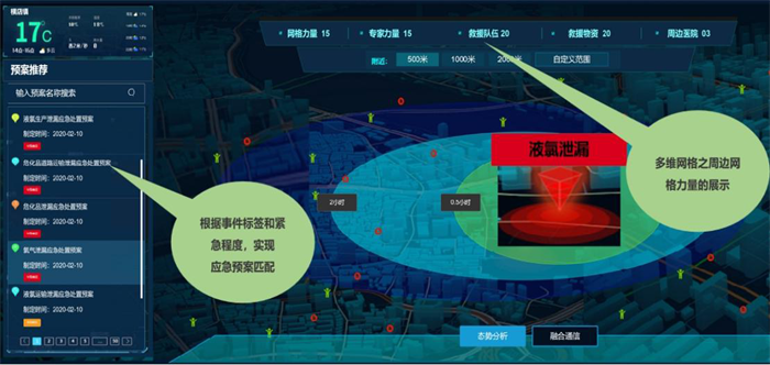 以横店某工厂突发液氯泄漏为例,当液氯泄漏发生时,部署在工厂内的感知设备会自动发现,并通过感知平台自动推送报警到智慧横店服务管理指挥大厅。系统自动报警类别,并启动响应的处置预案,以电话、短信等自动通知预案对应的应急指挥团队,并通过大厅内的融合通信系统建立指挥体系。指挥中心的大屏上实时展示应急力量(消防车,专业团队,网格员,志愿者等)的实时位置,周边应急资源位置(500米或1000米范围),同时自动汇聚事发位置周边摄像头,实时展示现场情况。