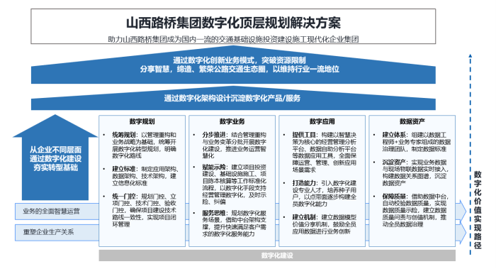 围绕山西路桥集团数字化转型的战略方针与转型过程中的痛点问题,金山云以“合理规划、科学把控、分布实施”为理念、遵循国资委有关“国有企业加强数字化转型”的要求,助力客户发掘数字化转型过程中的焦点、提炼数字化转型的内涵,研究企业产生“数据孤岛”问题,直击痛点,为客户规划设计数字化转型的发展路径、逐步落地数字化转型过程中的各阶段任务,通过顶层设计为路桥集团打造具有行业属性、企业特性的数字化体系,指导集团数字一体化建设任务。