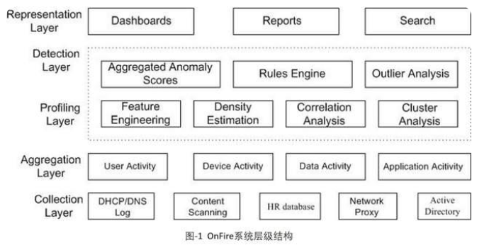 OnFire系统是由三部分组成:网络流量采集系统(HoloFlow),实体行为分析系统(HoloML)和管理系统(HoloVision)。网络流量采集器会从网络关键设备节点,通常从汇聚交换机处,接受并处理网络原始流量,生成网络中设备、应用、数据(文件和网页)以及用户的网络行为日志,并保存于数据仓库。分析平台将这些日志映射为四类实体行为,分别是:用户实体、设备实体、应用实体和数据实体。然后根据实体间的行为逻辑关系、时序关系以及地理位置关系等,生成动态关联的网络全息图。同时,利用数理统计、机器学习等算法为每个实体画像构建正常行为基线。最后再通过实体的正常行为画像识别比对出异常行为,并提醒管理员及时对异常行为追踪溯源。
