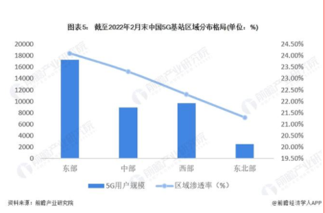 用户渗透率方面,东部地区也处于领先地位,截至2022年2月末,我国东、中、西部和东北地区5G移动电话用户分别达17270万、8925万、9696万、2499万户,占本地区移动电话用户总数的比重分别为24.1%、23.3%、22.3%、21.3%。无论是在用户数量还是渗透率方面,东部地区都发展较好。