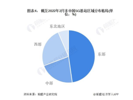 从我国5G建设的区域分布来看,截至2月份末,东、中、西部和东北地区5G基站分别达到71.9万、32.4万、36.6万、9.7万个,占本地区移动电话基站总数的比重分别为16.6%、14.8%、12.9%、14.2%,东部地区占比领先。