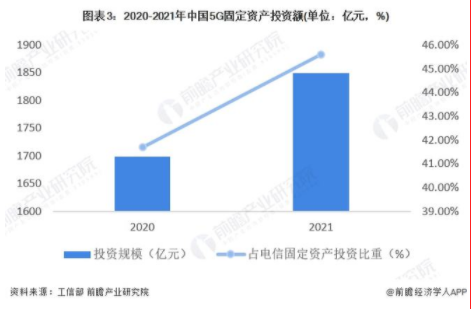 固定资产投资额方面,2021年,我国三家基础电信企业和中国铁塔股份有限公司共完成电信固定资产投资4058亿元。其中,移动通信的固定资产投资额为1943亿元,占全部投资的47.9%;而5G投资额达1849亿元,占全部投资的45.6%,占比较上年提高8.9个百分点。