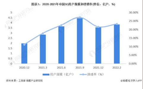 5G,第五代移动通信技术,(5th Generation Mobile Communication Technology,简称5G)是具有高速率、低时延和大连接特点的新一代宽带移动通信技术,是实现人机物互联的网络基础设施。2021年,是我国5G网络快速发展的一年。截至2021年底,我国移动电话用户规模16.43亿户,其中5G用户达到3.55亿户,在移动电话用户数中占比达21.61%,较2021年第三季度有所下降,但较2020年年底仍大幅增长1.56亿户,渗透率也增长了10%。2022年2月份末,5G移动电话用户达3.84亿户,比2021年末净增2905万户,占移动电话用户总数的23.3%。