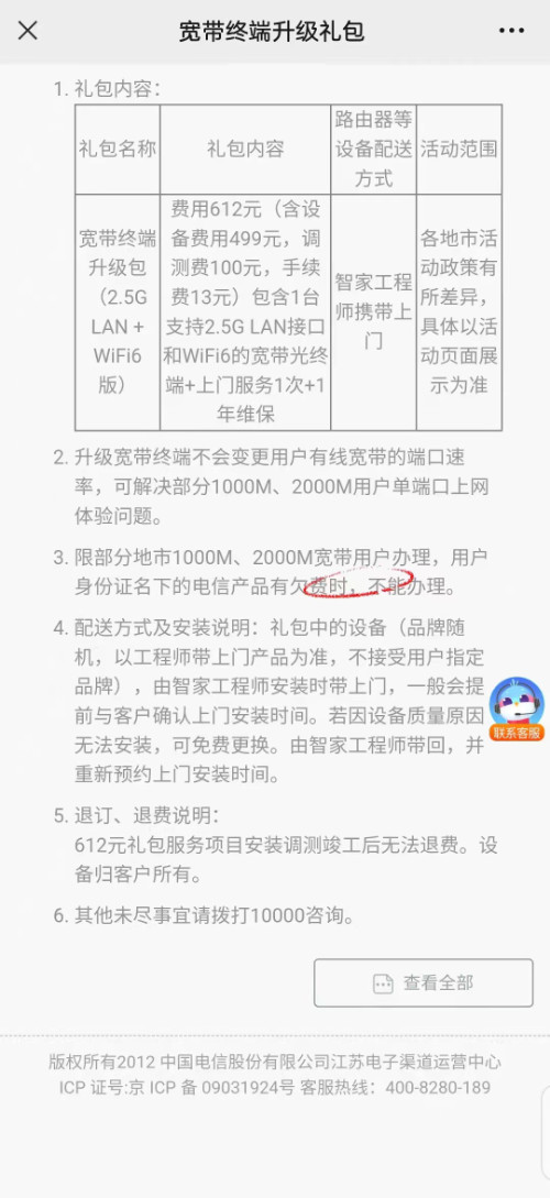 4月14日,一位通信人家园的网友表示,江苏电信推出了全新宽带终端升级包,其中包含一台支持2.5G LAN接口和WiFi6的宽带光纤终端+上门服务一次+一年维保,费用为612元/月。