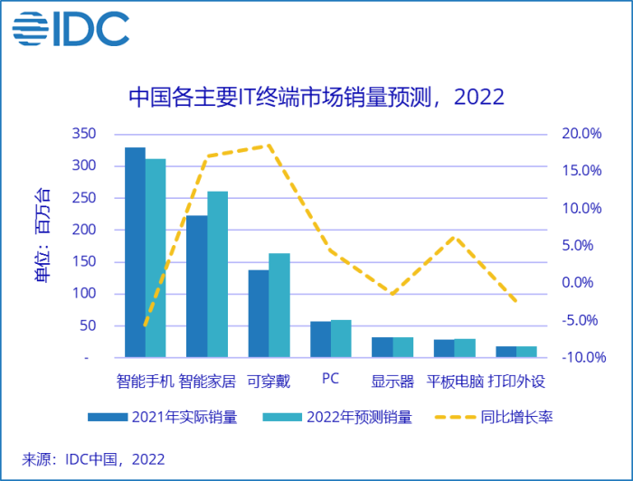 由于全国阶段性疫情影响,IDC将下调对2022年全年终端市场预测数据。2022年中国终端市场最初预期出货量达到8.8亿台,增长率为6.0%。其中智能手机出货量3.1亿台,同比下滑5.5%,PC出货量6,000万台,同比增长4.3%。但截止到4月初,各地不间断的疫情导致市场库存明显提升,物流、上游配件和整机生产的不确定因素也较为突出;同时,结合近期原油等原材料成本上升。综合判断下,IDC将下调2022年全年终端市场预测,其中智能手机、PC、显示器等影响较大;可穿戴,平板等影响相对较小。(备注:IDC定义的终端产品包括智能手机、智能家居、可穿戴、PC、显示器、平板电脑、打印外设、ARVR)。