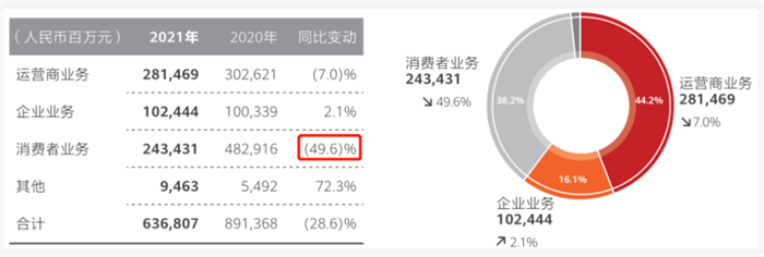 手机出货量2.4亿台,全球第二,这是华为2019年的“高光时刻”。主营PC、手机、IoT设备的“华为消费者BG”也因此一直被外界称作“最赚钱的业务”,甚至许多消费者只知华为是一家手机公司,不知其ICT通信业务。2020年华为消费者业务创下4829亿的营收佳绩,但次年该板块业务营收即被腰斩(同比-49.6%),这与半导体材料5G芯片断供、全球手机出货量下降关系密切。对于终端市场来说,最突出的表现就是其一系列新品手机无法实现5G功能,让不少消费者扼腕叹息。
