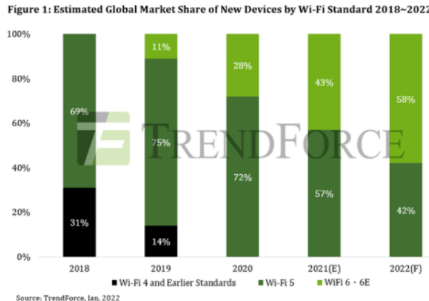 Wi-Fi 6和Wi-Fi 6E将在2022年成为全球市场份额达到58%的主流技术,这是因为WiFi 6/6E拥有更好的技术特点、成熟度和产品认证状态。此消彼长,Wi-Fi 5的份额则会从2021年的57%降至42%。