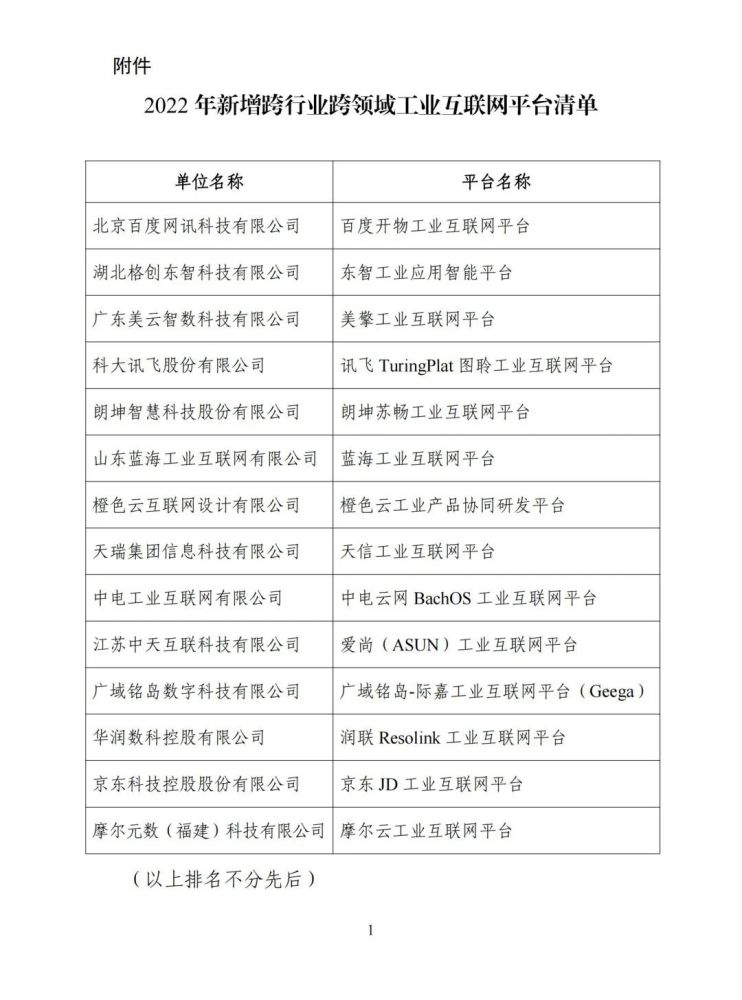 据悉,为进一步贯彻落实《中华人民共和国国民经济和社会发展第十四个五年规划和2035年远景目标纲要》关于“在重点行业和区域建设若干国际水准的工业互联网平台”的重要部署,按照《工业和信息化部办公厅关于组织申报2022年跨行业跨领域工业互联网平台的通知》工作安排,经企业申报、地方推荐、专家评审等环节,形成了2022年新增跨行业跨领域工业互联网平台清单。