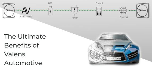 在Valens官网,我们看到一张汽车信号链接的解决方案示意图,这张图很好地展示了Valens的方案优势,利用Valens芯片组,能在一条线缆上同时传输音视频、USB、电源、控制和以太网,从而验证了上方Gideon Kedem的表述。