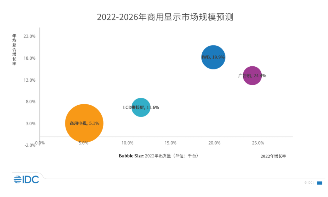 IDC最新发布的《中国商用显示市场回顾与未来展望》报告显示,预计2022年中国商用显示市场四类液晶产品出货量达到901万台,同比增长11%,其中交互式电子白板市场同比增长19.9%、广告机同比增长24.4%、LCD拼接屏同比增长11.6%、商用电视同比增长5.1%。(IDC商用显示设备包括:交互式电子白板、广告机、LCD拼接、商用电视、LED小间距(非标准产品))。