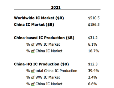 如果中国的IC制造业在2026年增长到582亿美元,正如IC Insights预测的那样,中国的IC生产仍将仅占2026年全球IC市场总额7177亿美元的8.1%。即使在为一些中国生产商的IC销售额增加了显著加成之后(许多中国IC生产商是代工厂,他们将其IC销售给将这些产品转售给电子系统生产商的公司),中国的IC生产仍可能占到2026年,仅占全球IC市场的10%左右。