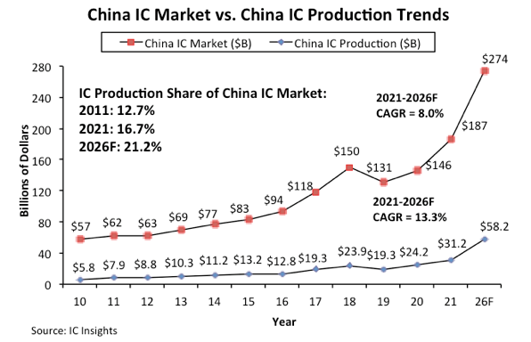 IC Insights报道称,中国距离半导体自给自足还有很长的路要走。虽然到2026年中国的芯片产量将占其国内IC市场的21.2%,但三星、SK海力士和台积电等外国公司预计将在此期间占中国IC产量的50%以上。