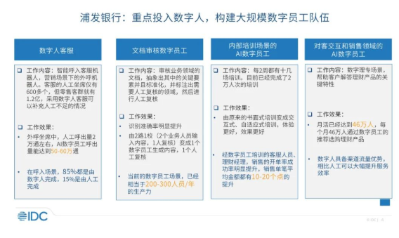 尽管市场上已经有诸多AI数字人部署或者进入POC阶段,大部分案例都还在探索中。本次调研IDC也追踪了几个优秀的行业实践,包括浦发银行构建大规模数字员工队伍,以及中国纺织信息中心以AI内容生成打造生产力。