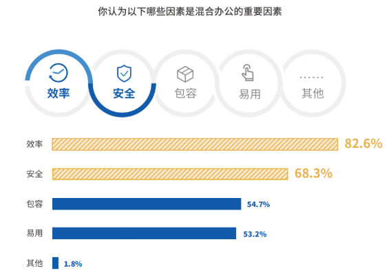 白皮书调研数据显示,混合办公模式下,安全和效率成为最受关注的核心问题。受访者把安全(68.3%)排在了混合办公中第二重要的要素,仅次于效率(82.6%)。