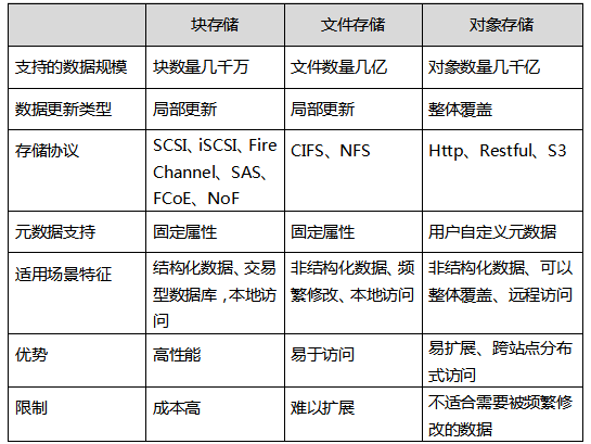 块存储数据是以数据块的形式进行管理,每个数据块只有一个地址,一旦被一个系统使用,就独占了,不能被共享。NAS数据是以文件的形式进行管理,在文件系统一层对外提供服务,通过CIFS或者NFS协议进行共享。对象存储是以对象的形式进行管理,采用扁平化方式,弃用了目录树结构,通过Restful或HTTP接口实现随时随地访问的共享和高速访问。这三种云存储类型的区别如下表所示: