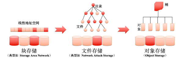 云存储从数据的存储和访问的方式来区分,包括数据块级云存储、文件级云存储和对象级云存储。这三种类型是由传统的SAN(Storage Area Network,存储局域网)、NAS(Network Area Storage,网络附加存储)和CAS(Content Addressed Storage,内容寻址存储)分别发展而来。