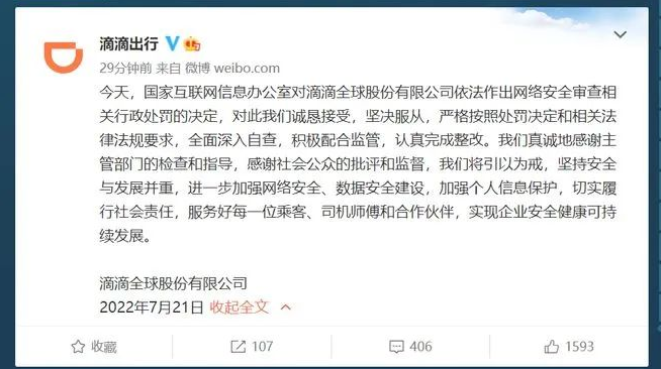 据“网信中国”微信公众号消息,国家互联网信息办公室对滴滴全球股份有限公司依法作出网络安全审查相关行政处罚的决定。