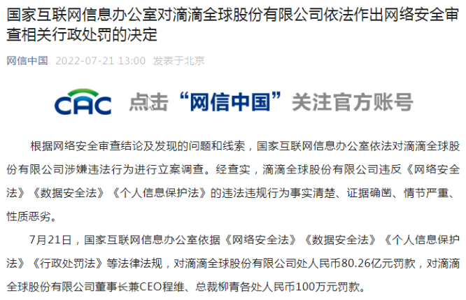7月21日,国家互联网信息办公室依据《网络安全法》《数据安全法》《个人信息保护法》《行政处罚法》等法律法规,对滴滴全球股份有限公司处人民币80.26亿元罚款,对滴滴全球股份有限公司董事长兼CEO程维、总裁柳青各处人民币100万元罚款。
