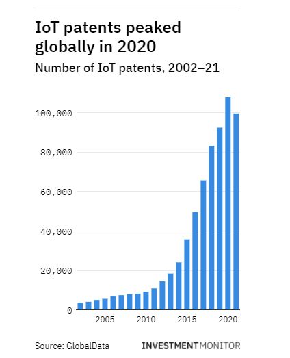为了确定物联网市场的地域优势,对GlobalData专利数据的分析表明,美国和中国遥遥领先。总体而言,从2010年到2020年的十年间,全球提交的物联网相关专利增加了十倍以上。