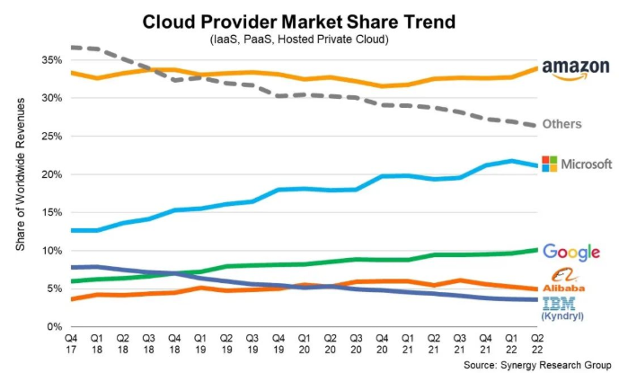 过去几年,在新冠疫情影响下,使得各界加速推进数字化战略,从而驱动智能化转型升级,继而达到降本增效目的。需要指出的是,各界通过云上进行创新的同时,企业在云基础设施服务上日益扩大。根据Synergy Research Group的最新数据显示,今年二季度企业在云基础设施服务上的支出接近550亿美元,同比增长29%,且12个月的达到2050亿美元。报告同时显示,本季度,亚马逊、微软和谷歌加起来占全球市场的65%,高于一年前的61%。