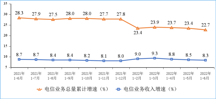 电信业务收入平稳增长,电信业务总量保持两位数增幅。上半年,电信业务收入累计完成8158亿元,同比增长8.3%。按照上年不变价计算的电信业务总量同比增长22.7%。