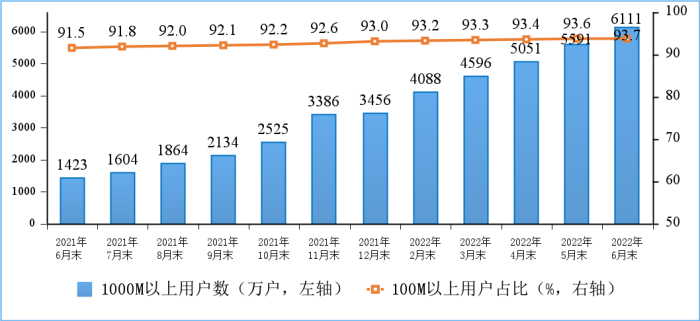 固定宽带接入用户数稳步增加,千兆用户占比超一成。截至6月末,三家基础电信企业的固定互联网宽带接入用户总数达5.63亿户,比上年末净增2705万户。其中,100Mbps及以上接入速率的固定互联网宽带接入用户达5.27亿户,占总用户数的93.7%,占比较上年末提升0.6个百分点;1000Mbps及以上接入速率的固定互联网宽带接入用户达6111万户,比上年末净增2656万户,占总用户数的10.9%。