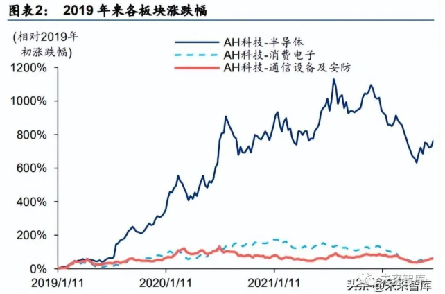 2019年至今半导体板块市值占比增加明显,行业地位在A股市场重要性显著提高。根据我们统计,自2019年初以来,得益于半导体国产化及科创板落地,A/H科技股半导体子板块市值增加了2.52万亿元(包含个股股价上涨,及新上市公司加入的贡献),达到2.82万亿元,较19年初增长了631%,相比之下A/H科技股手机产业链子板块市值增加了48%,通信及安防设备子板块市值仅增加了40%。