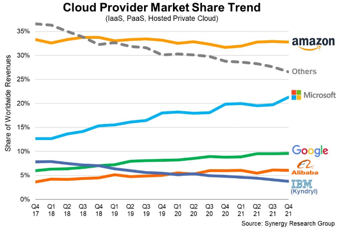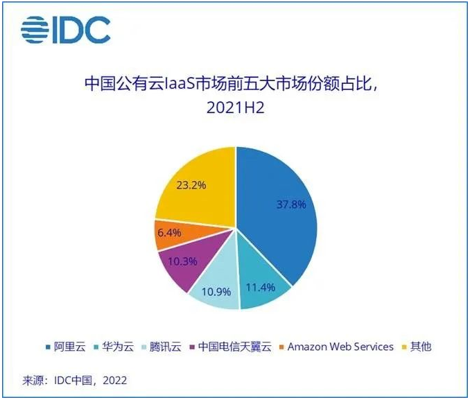 庞大的云服务市场,众多重量级玩家涌入。只是,厂商主要拥挤在公有云IaaS赛道上,但这一市场表现优异的还是亚马逊云、微软、谷歌、阿里巴巴等这些科技巨头,前五大厂商控制着全球近八成市场份额。