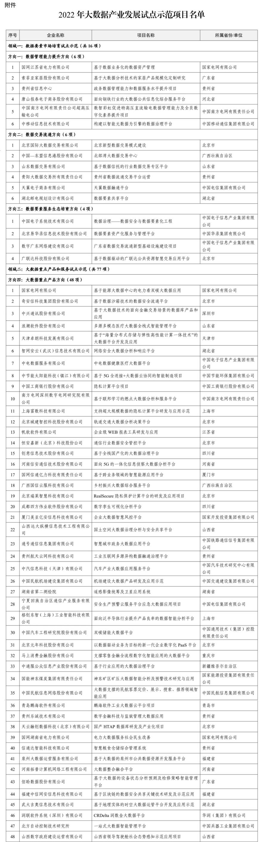 为深入实施国家大数据战略,落实《“十四五”大数据产业发展规划》,按照《工业和信息化部办公厅关于组织开展2022年大数据产业发展试点示范项目申报工作的通知》(工信厅信发函〔2022〕71号)要求,经企业申报、单位推荐、专家评审、网上公示,确定了2022年大数据产业发展试点示范项目名单(见附件),现予以公布。
