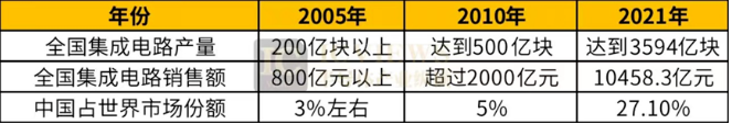 美国在1958年首先研制成半导体集成电路,7年后,我国也独立自主地制造出中国产的集成电路。而之后美国用8年(1966年)的时间研制出大规模集成电路(LSI)电路,我国则用了7年时间(1972年)制造出LSI电路,此时我国与领先技术相差6年;美国在1982年制造出超大规模集成电路(VLSI)电路,我国则在4年后(1986)就制造出了VLSI电路,此时我国与世界先进水平的差距正在缩小。但随后在特大规模集成电路上我国与世界先进水平的差距再次扩大,达到了13年。