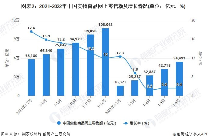 截止至2022年1-6月全国网上零售额达到63007亿元,累计增长3.1%。其中,实物商品网上零售额达到54493亿元,累计增长5.6%,占社会消费品零售总额的比重为25.9%;在实物商品网上零售额中,吃类、穿类、用类商品分别增长15.7%、2.4%、5.1%。