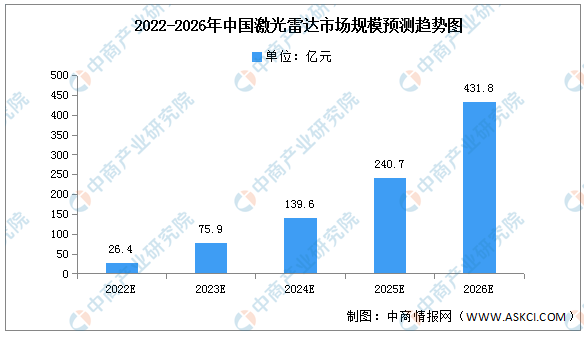 自动驾驶是当前全球汽车技术及产业的重要发展趋势,在市场和政策的双擎驱动下,我国汽车驾驶自动化技术发展迅速。借助自动驾驶东风,激光雷达正迎来爆发的一年。未来中国激光雷达市场也将呈现快速增长。预计2022年-2026年中国激光雷达市场规模将保持增长,从26.4亿元增长至431.8亿元,预计年均复合增长率将达101.1%。