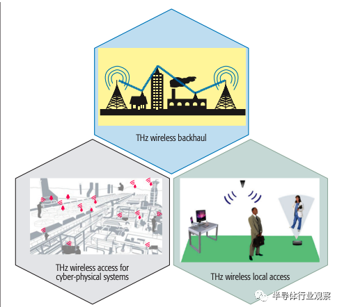 在III-V半导体之外,使用硅基材料的CMOS和SiGe的太赫兹通信技术也在蓬勃发展。相对于III-V族半导体来说,CMOS和SiGe芯片具有集成度高,成本低的优势,因此获得了学界和业界的一致关注。对于太赫兹来说,CMOS和SiGe的主要挑战在于晶体管截止频率较低,工作带宽也较低。截止频率地意味着CMOS和SiGe芯片虽然能工作在太赫兹频段,但是其输出功率会较低,也就是说难以实现长距离通信;带宽低则意味着CMOS和SiGe芯片难以直接支持工作在大频宽的太赫兹通信,而必须使用系统级的方法(例如将一个较大的频段拆分成多个带宽较小的子频段)来实现通信。目前,CMOS和SiGe芯片在太赫兹通信上的应用还主要在于短距离通信(例如1米左右的范围里)。展望未来,CMOS和SiGe对于太赫兹通信领域的研发还将主要在于电路级以及系统级的改进,目前来看半导体工艺的改善并不能提升CMOS/SiGe电路在太赫兹频段的性能(例如CMOS对于太赫兹频段来说65nm是最好的工艺节点之一)。