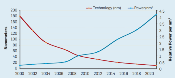 以前可以在保持相同功率预算的情况下增加晶体管数量,但现在晶体管数量翻倍意味着功耗也翻倍。随着Dennards Scaling定律的结束,芯片上内核数量的增加意味着功率也在以几乎相同的速度增长。