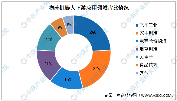 物流机器人下游应用主要在汽车工业和家电制造领域,占比分别为24%和22%。电商仓储物流、烟草制造、3C电子、食品饮料占比分别为15%、15%、13%和6%。