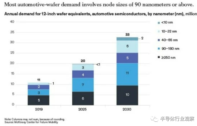 麦肯锡报告称,未来大多数汽车晶圆需求将涉及90纳米及以上的节点,因为许多汽车控制器和电动动力系统,包括电驱动逆变器和执行器,都依赖于这些成熟的芯片。到2030年,此类节点将占汽车需求的67%左右。