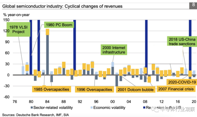 从20世纪60年代开始,半导体产业已经成为全球经济的支柱。过去四十多年,半导体行业的收入经历了几次大的变化:1978年VLSI项目实施下,使得日本研发出了DRAM;1980年PC时代大爆炸;2000年移动互联网的兴起;乃至现在的地缘政治因素,这些都导致整个半导体经历了不同的周期性变化(如图1所示)。