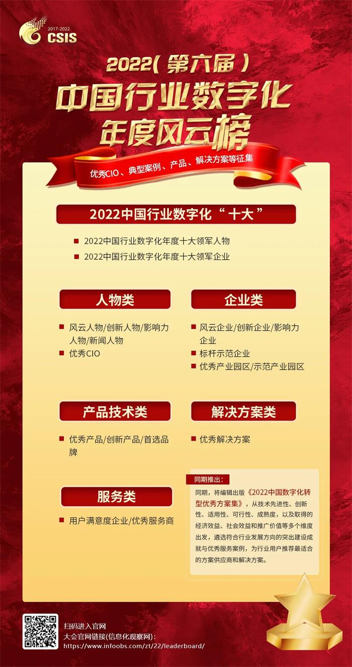 在相关部门的指导下,作为第三方智囊机构,由信息化观察网组织发起的“2022(第六届)中国行业数字化年度风云榜”线上评选活动,将从权威的视角,在全国范围内征集行业内有突出贡献的人物、企业、产品、技术、应用案例等候选材料(以下简称候选材料),为各行业企业的“智转数改”提供权威、专业、理性的指导,将数字化转型持续向纵深推进。