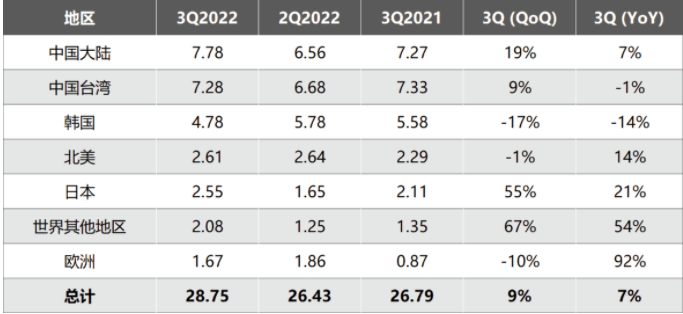 国际半导体产业协会SEMI近日发布《全球半导体设备市场统计报告》(WWSEMS)。报告显示,2022年第三季度,全球半导体设备销售额环比增长9%,同比增长7%,达到287.5亿美元。