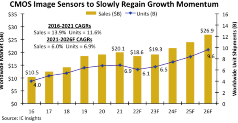 今年CMOS图像传感器市场情况似乎发生了变化。IC Insights预测,2022年CIS市场将出现13年来的首次下降11%至61亿颗,同时销售额也将下降7%至186亿美元。