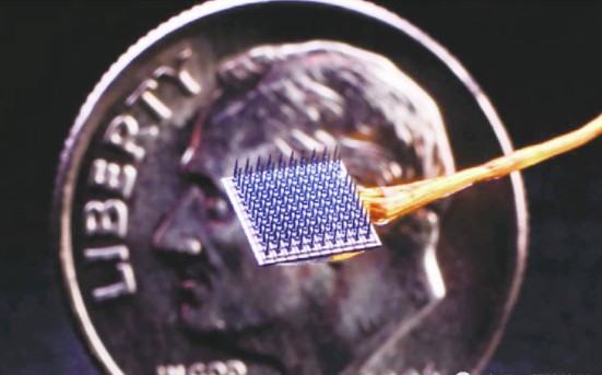 图3.由BrainGate研究团队研发的脑机接口,由100个细小金属电极组成(大小同10分的美元硬币),用于记录大脑皮质运动区在手写过程中产生的信号。然后通过此类信号在电脑上实时生成相应文本。来源:BrainGate.org(public domain)。