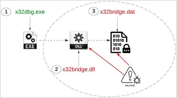 在Unix 42团队观察到的近期攻击中,威胁分子使用了“x64dbg.exe”这个Windows调试工具的32位版本和“x32bridge.dll”被投毒的版本,后者加载PlugX攻击载荷(x32bridge.dat)。