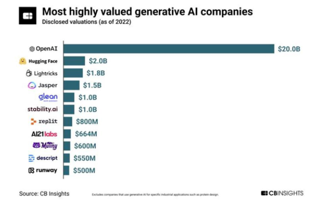 此外,CB Insights统计,AIGC领域已有6家独角兽,其中,推出了ChatGPT的OpenAI高达200亿美元,Hugging Face20亿美元,Lightricks 18亿美元,内容建立套件AI驱动企业Jasper 15亿美元,Glean和Stability AI为10亿美元。
