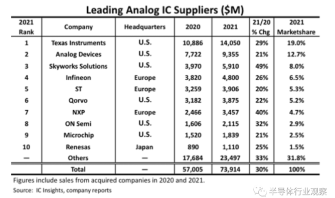 不过,总有例外。如德州仪器、英飞凌、Microchip、Wolfspeed和安森美就在近期向外展现了他们将继续扩产的决心。值得一提的是,这些芯片公司几乎都是排名前十的模拟芯片巨头。