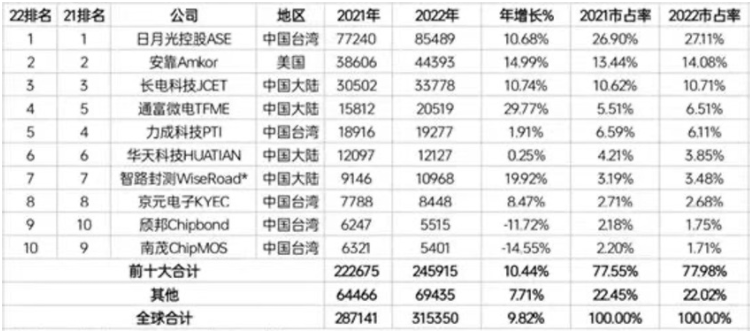 根据日前发布的企业财报数据显示,2022年委外封测整体营收较2021年增长9.82%,达到3154亿元,其中前十强的营收达到2459亿元,较2021年增长10.44%。
