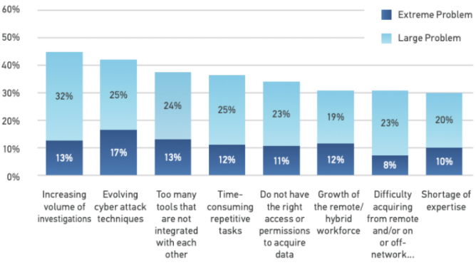 45%的受访者认为:“不断增长的数字取证需求和数据量”是影响DFIR调查的最大挑战,其中13%认为这是一个非常严重的问题,32%认为这是一个较严重的问题。