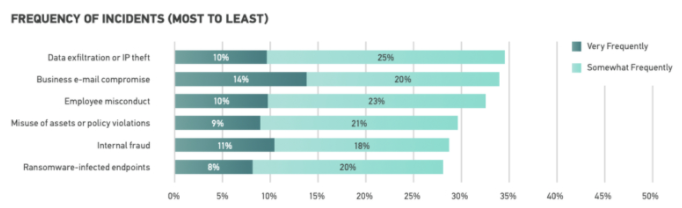 据报告研究数据显示,2022年数据泄露与账号窃取占整体取证活动的35%,是最常见的DFIR事件,紧随其后的是商业电子邮件泄露(34%)。有14%的受访者表示,他们的组织会经常遭遇BEC骗局。其他常见DFIR事件包括员工不当行为(33%)、滥用资产或违反政策(30%)、内部欺诈(29%)和感染勒索软件的端点(28%)。