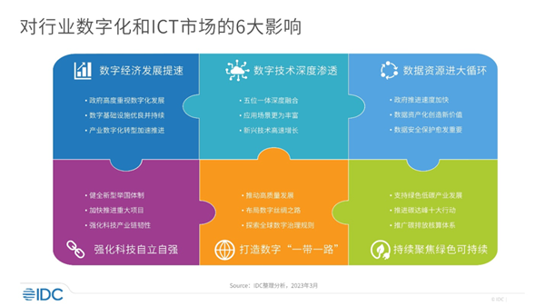 IDC认为,此次两会相关政策和任务举措对行业数字化发展和ICT市场的影响体现在6大方面:数字经济发展提速、数字技术深度渗透、数据资源进大循环、强化科技自立自强、打造数字“一带一路”、持续聚焦绿色可持续。
