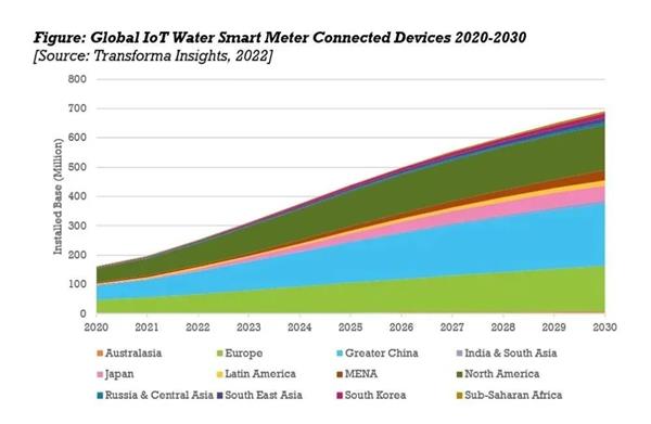 在市场方面,现在全球对智能水表的需求都在猛增。据Transforma Insights的一份研究报告显示,到2030年底,智能水表连接总数将达到7亿个,其中,大中华区将成为设备数量最多的地区,占连接设备总数的31%,其次是北美(29%),欧洲(28%)。